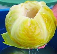 Choosing the right cabbages is an art in itself. They must be round, firm, with big healthy leaves, which can peel away easily – check that by pulling off one of the outside leaves, and if it breaks, it means the cabbage won't work for wrapping around the meat. At home cut out the core of the cabbages and fill the cavities